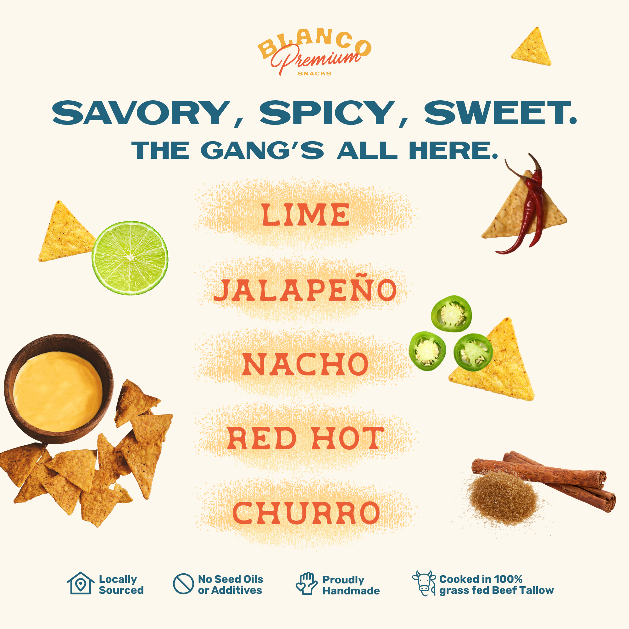 The Mixed Bundle has them all — Original, Nacho, Jalapeño, Lime, Red Hot, and Churro — a full lineup of clean, crunchy goodness.